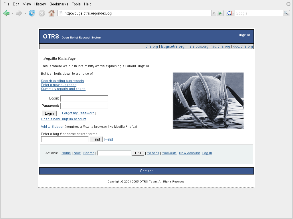 To submit bugs visit http://bugs.otrs.org/ (see Figure below). Please take note of the difference between a bug and a configuration issue. Configuration issues are problems that you encounter when setting a system, or general questions regarding the use of OTRS. Bug reports should only be used for issues with the source code of OTRS itself, or to file enhancements for OTRS. All your bug reports and enhancement requests are very welcome in the bug tracker.