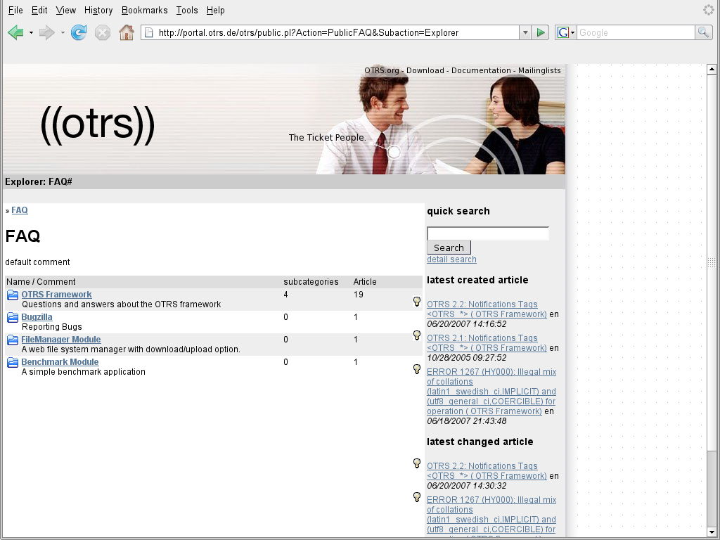 In addition to the web interfaces for agents and customers, OTRS also has a public web interface which is available through the FAQ-Module. This module needs to be installed separately. It provides public access to the FAQ system and lets visitors search through FAQ entries without any special authorization.