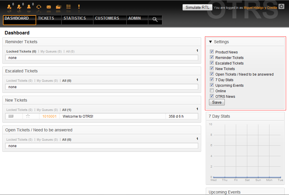 The content of this screen is arranged in two main columns, on the left column you normally can see information about tickets classified by their states like: reminder, escalated, new, and open. On each of this widgets you can filter the results to see all of the tickets that you are allowed to access, tickets you have locked, the ones that are located in agent defiend queues, among other filters. There are also other kind of widgets in this column and they are all described below.