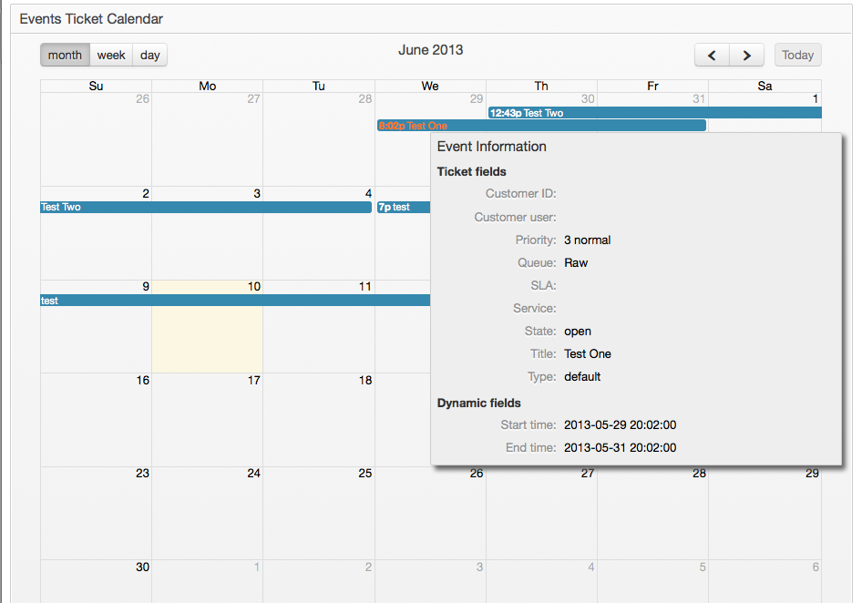 A calendar event (for this widget) is defined when a new ticket is created, the Events Ticket Calendar feature has to be enabled, and it requires two new fields to be displayed in ticket creation screens, one for the event start time and the other one for the end time, this times determine the duration of the event.