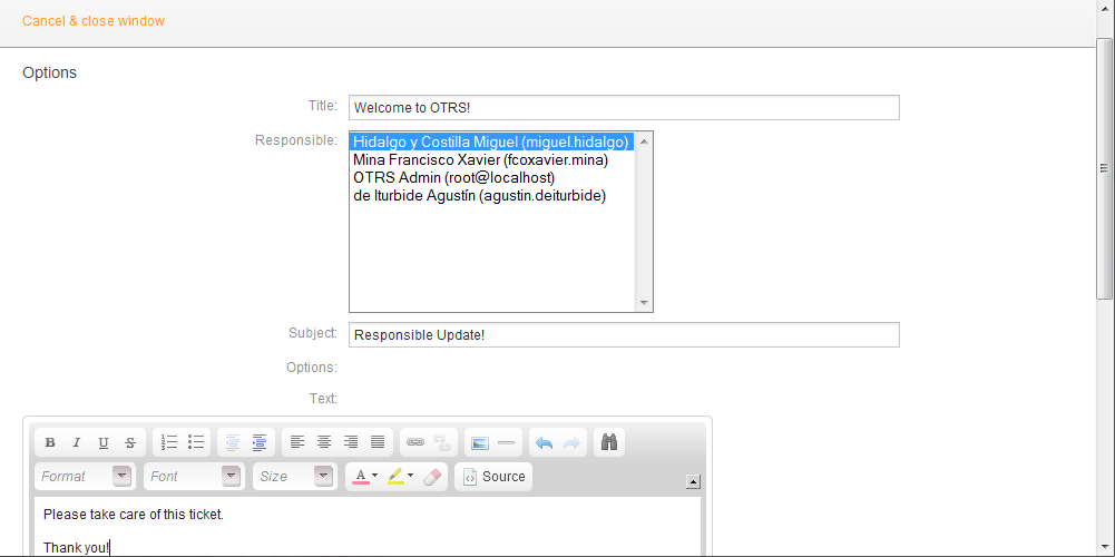 After clicking on "Responsible", a pop-up dialog to change the responsibility of that ticket will open (see Figure below). This dialog can also be used to send a message to the new responsible agent.
