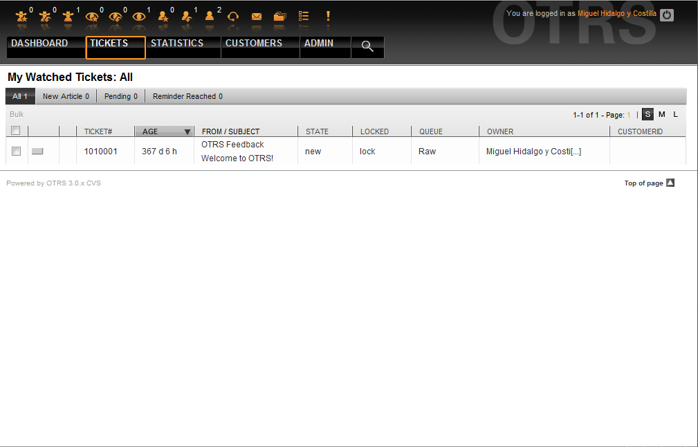 The list of all watched tickets can be accessed through the Watched view of the OTRS agent interface (see Figure below), as soon as the ticket watcher feature gets activated.