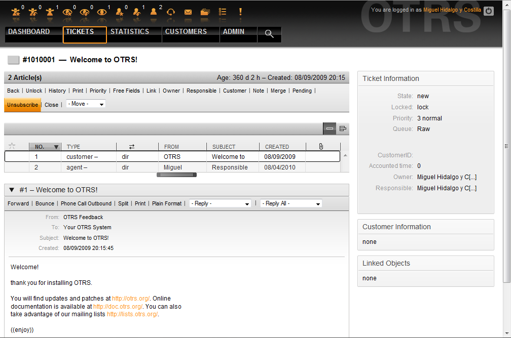 From OTRS 2.1 on, it is possible to assign a person as being responsible for a ticket, in addition to its owner. Moreover, all activities connected with the ticket can be watched by someone other than the ticket owner. These two functionalities are implemented with the TicketResponsible and TicketWatcher features, and facilitate the assignment of tasks and working within hierarchical team structures.