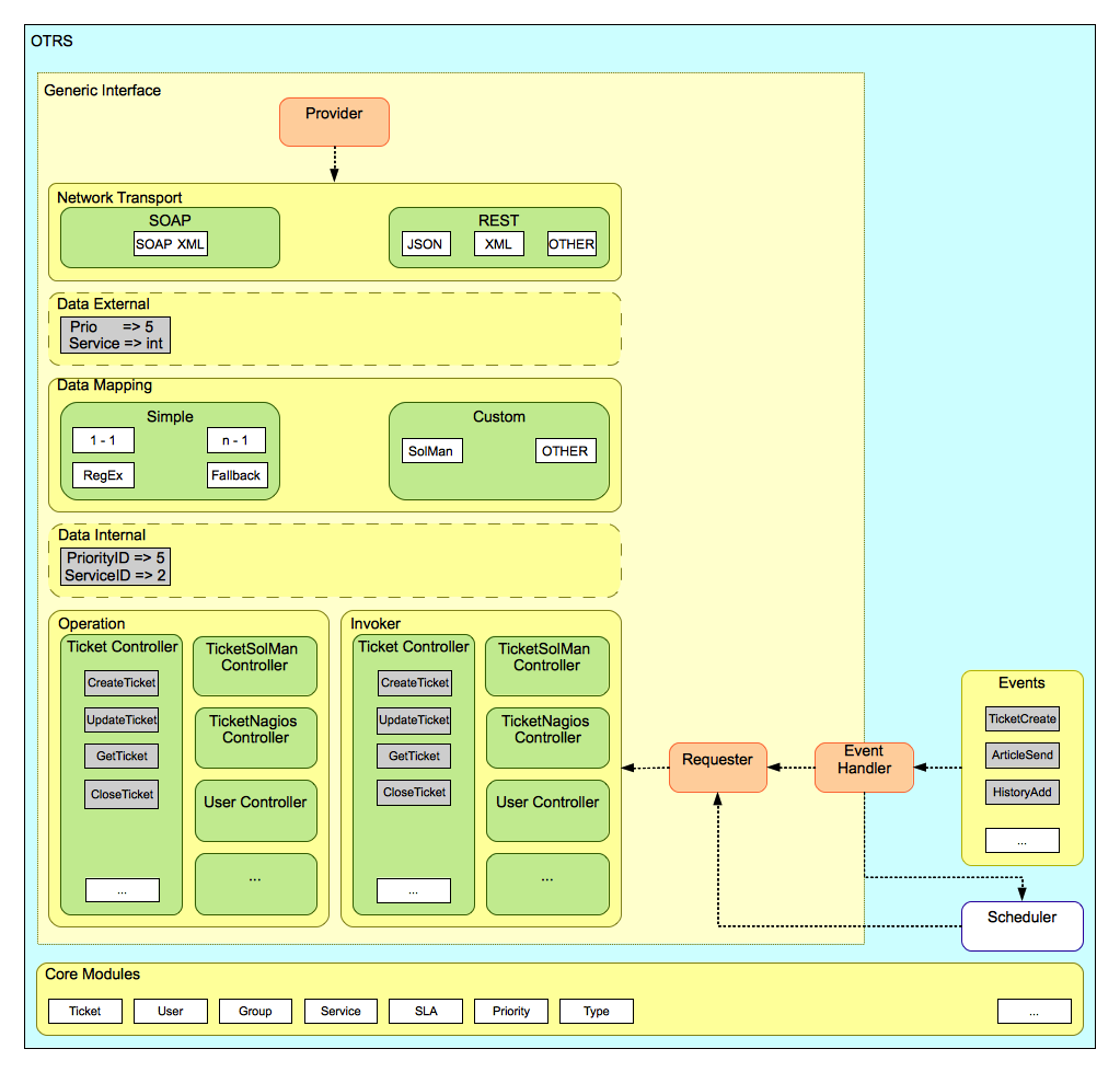 Requester communication could be initiated during an event triggered by a Generic Interface module or any other OTRS module. This event is catched by the event handler and depending on the configuration the event will be processed directly by the requester object or delegated to the Scheduler (a separated deamon designed to process tasks asynchronously).