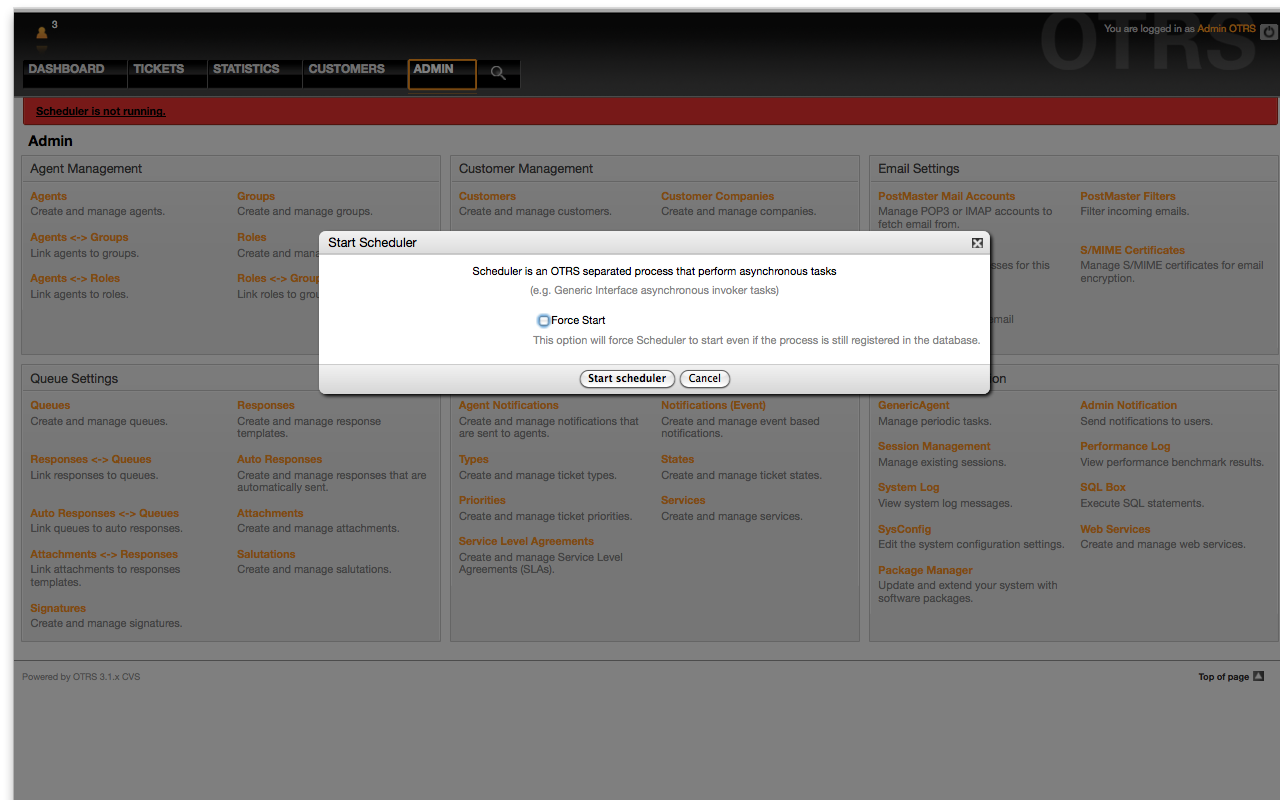 By clicking on the Scheduler not running notification link (either warning or alert) a dialog box will open to let you start the Scheduler process again. The Scheduler can be started normally or forced to start, by clicking on the appropriate check box in the dialog.